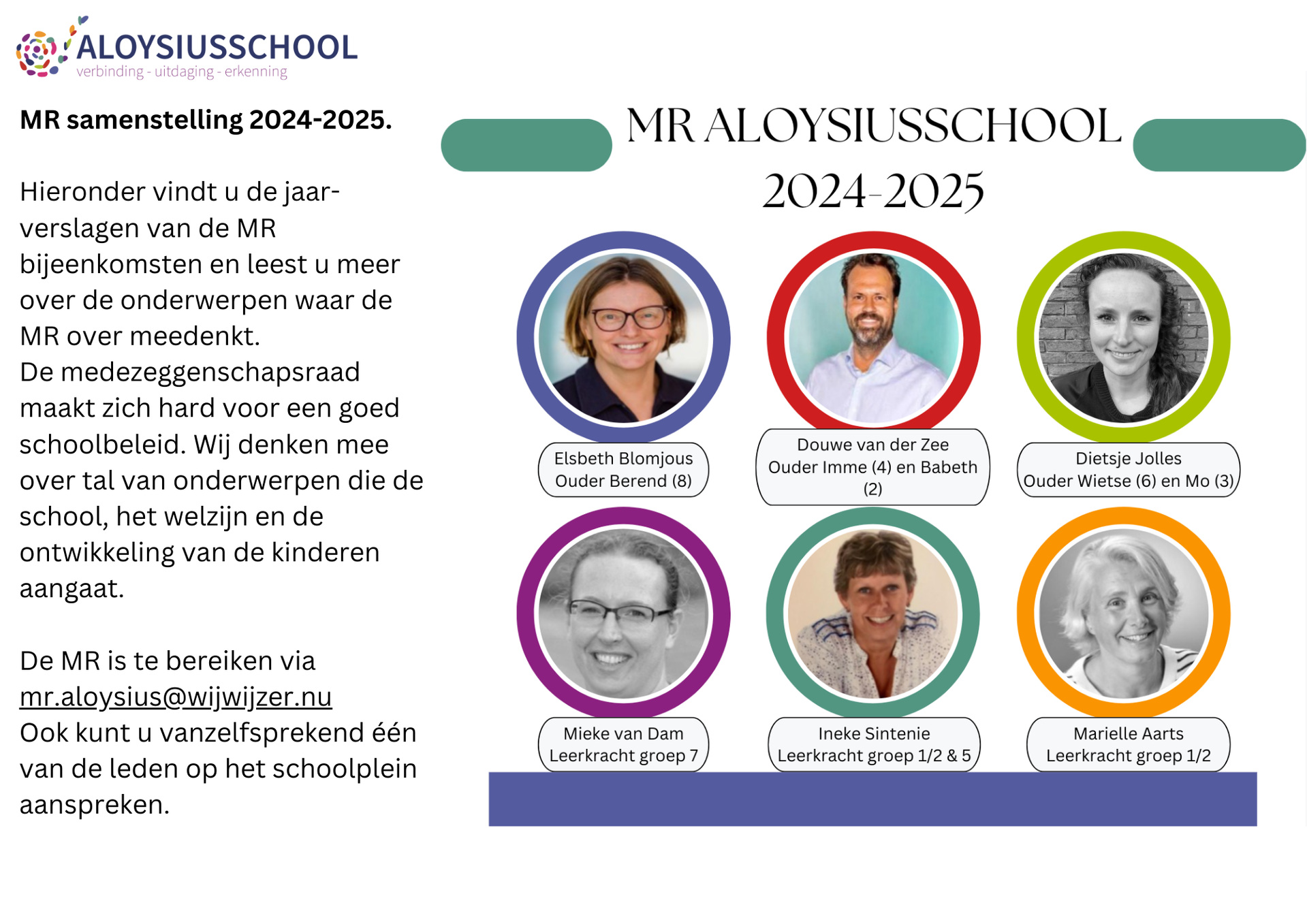 Mocht u vragen hebben, of onderwerpen die besproken moeten worden dan kunt u de MR bereiken via ons e-mailadres (mr.aloysius@wijwijzer.nu). Natuurlijk kunt u ook één van ons aanspreken op het schoolplein.